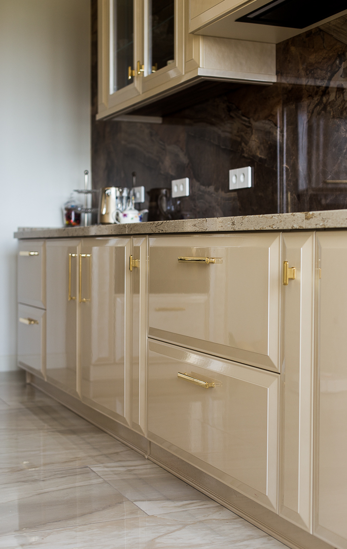 Глянцевая кухня с фрезерованными фасадами верхних шкафов